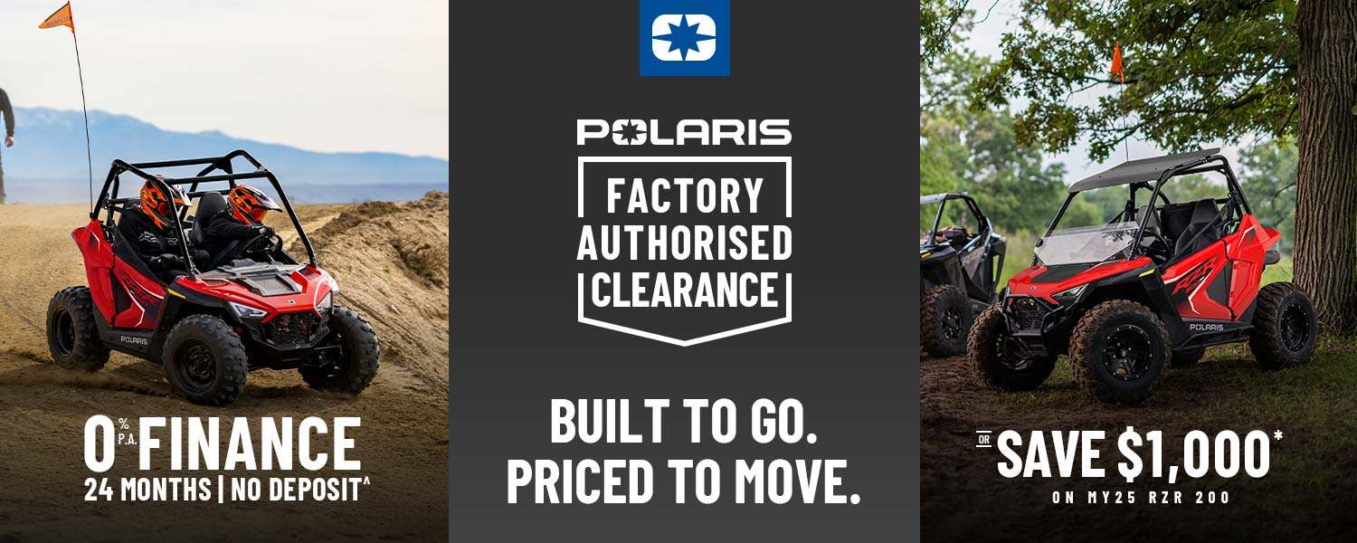 ^Information is valid as at 1 October 2025 and subject to change. 0% p.a. comparison rate (0% p.a. interest rate) is only available to private buyers approved by Pepper Asset Finance Pty Limited (PAF) for a 24 month fixed interest rate loan term with 0% deposit. Loan must be approved by 31 December and settled by 6 January 2026. Offer available for New or Demonstrator MY25 RZR 200. While stocks last. Not available to ABN holders. Not available in conjunction with any other offer. Offers and promotions may be continued, withdrawn or changed at any time without notice. Extended delivery times may apply. Applications for credit are subject to loan assessment and eligibility criteria and lending limits. Terms, conditions, fees and charges apply. Information provided is factual information only, and is not intended to imply any recommendation about any financial product(s) or constitute tax advice. If you require financial or tax advice you should consult a licensed financial or tax adviser. Credit is provided by Pepper Asset Finance Pty Ltd ABN 56 165 183 317 Australian credit license 458899. Comparison rate is calculated based on a secured loan of $30,000 and a term of 5 years. WARNING: This comparison rate is true only for the example given and may not include all fees and charges. Different terms, fees or other loan amounts might result in a different comparison rate.
